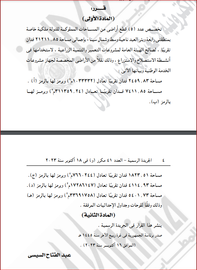 الجريدة الرسمية تنشر قرار السيسي بتخصيص أراضٍ بمنطقتي رابعة وبئر العبد لـ الاستصلاح والاستزراع