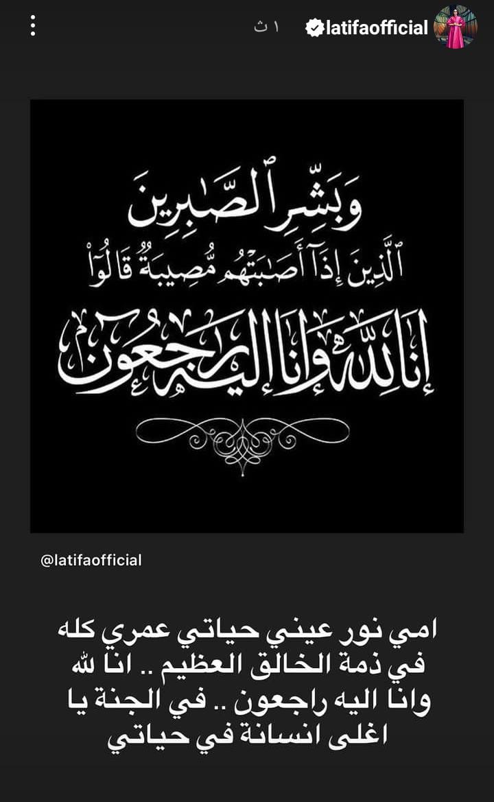 وحرصت لطيفة على أن ترثي والدتها بكلمات مؤثرة، حيث كتبت ستوري، عبر حسابها الشخصي بموقع انستجرام: أمي نور عيني حياتي في ذمة الخالق العظيم، إن لله، وإنا إليه راجعون، في الجنة يا أغلى إنسانه في حياتي.