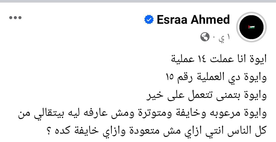 وكتبت البلوجر إسراء عبر صفحتها الشخصية بموقع التواصل الاجتماعي فيسبوك: أيوة انا عملت 14 عملية.. وأيوة دي العملية رقم 15 وأيوة بتمنى تتعمل على خير، مرعوبة وخايفة ومتوترة ومش عارفة ليه بيتقالي من كل الناس انتي ازاي مش متعودة وازاي خايفة كدة؟.