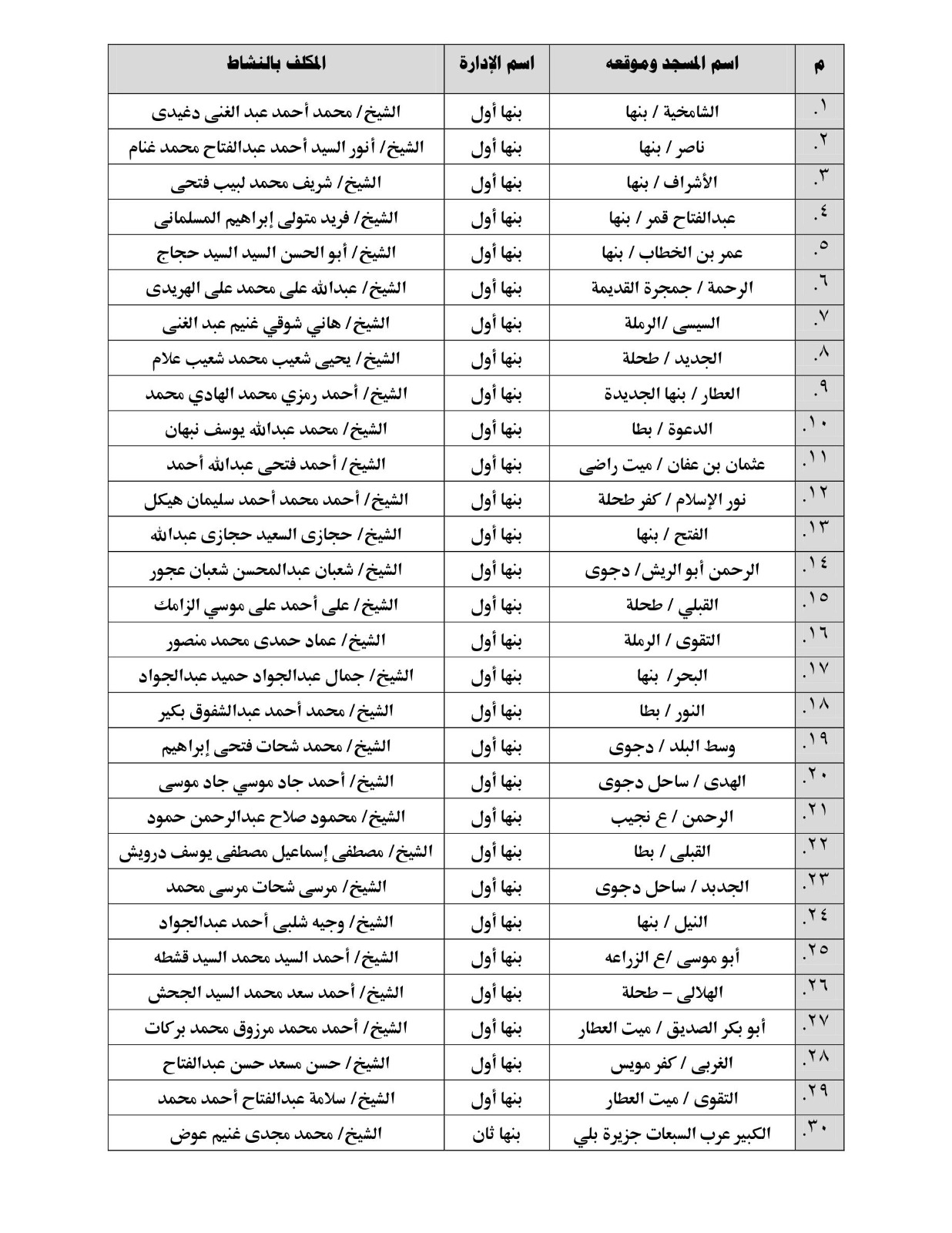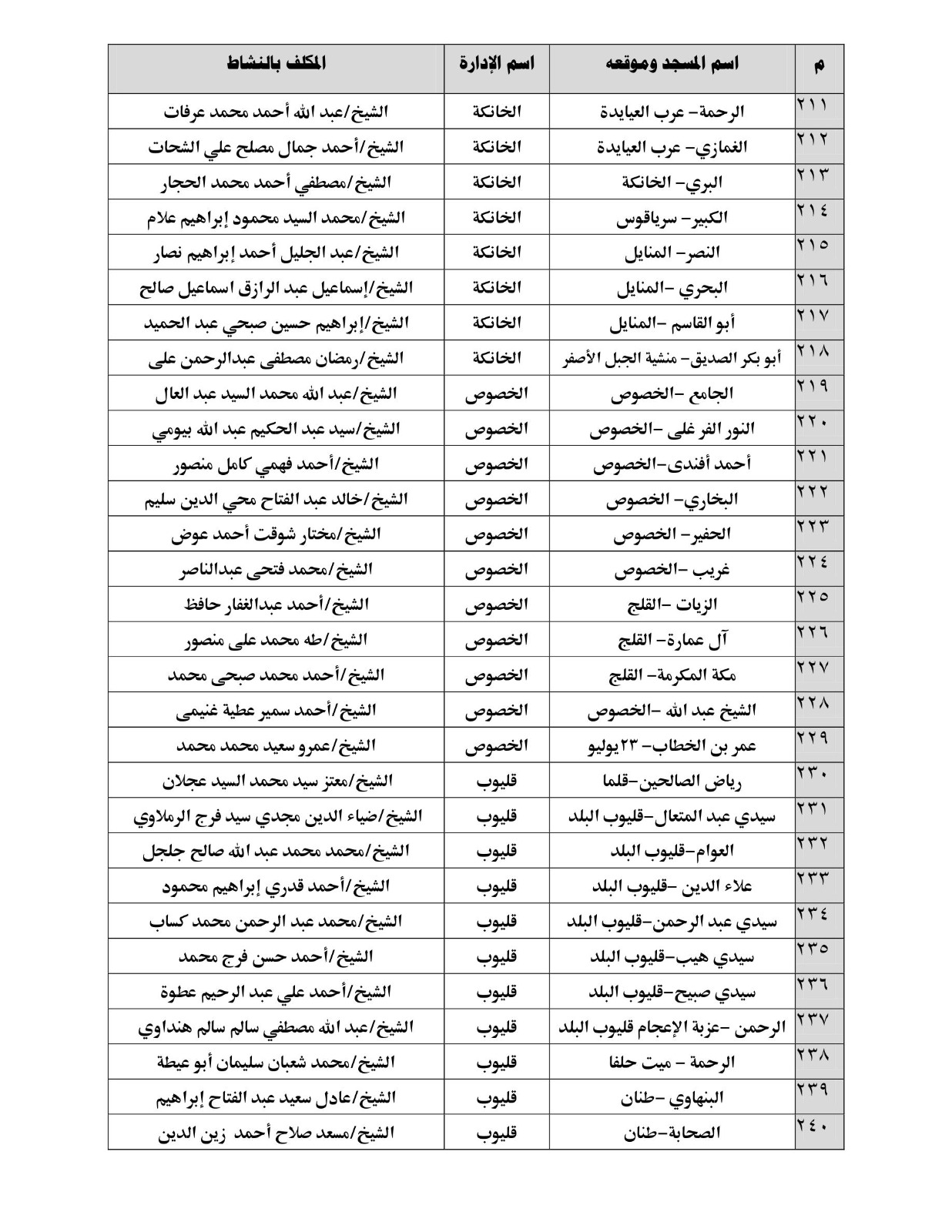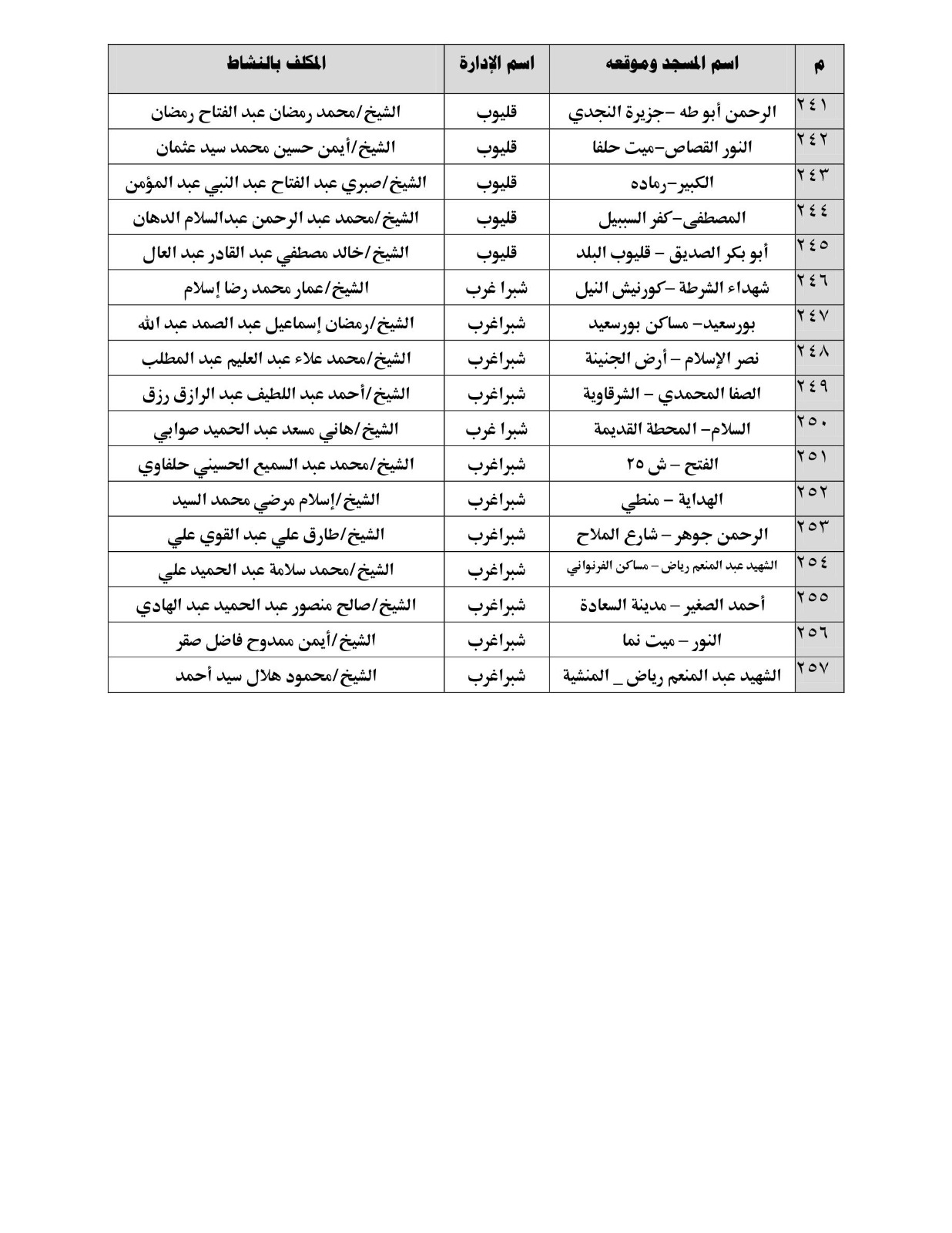 وأكدت وزارة الأوقاف في بيان، أنه سيقوم إمام المسجد بمراجعة الجزء الثلاثين من القرآن الكريم مع بيان معاني المفردات ومقاصد السور من خلال كتاب (البيان على المنتخب) من إصدارات المجلس الأعلى للشئون الإسلامية، مع شرح ما تيسر من الأخلاق والآداب العامة، ويسرنا أن ننشر أسماء المساجد ومواقعها التي سيكون بها مبادرة "حصن طفلك" بمحافظة القليوبية، فعلى من يرغب التواصل مع إمام المسجد لتسجيل أبنائه للمشاركة في المبادرة وذلك على النحو التالي: