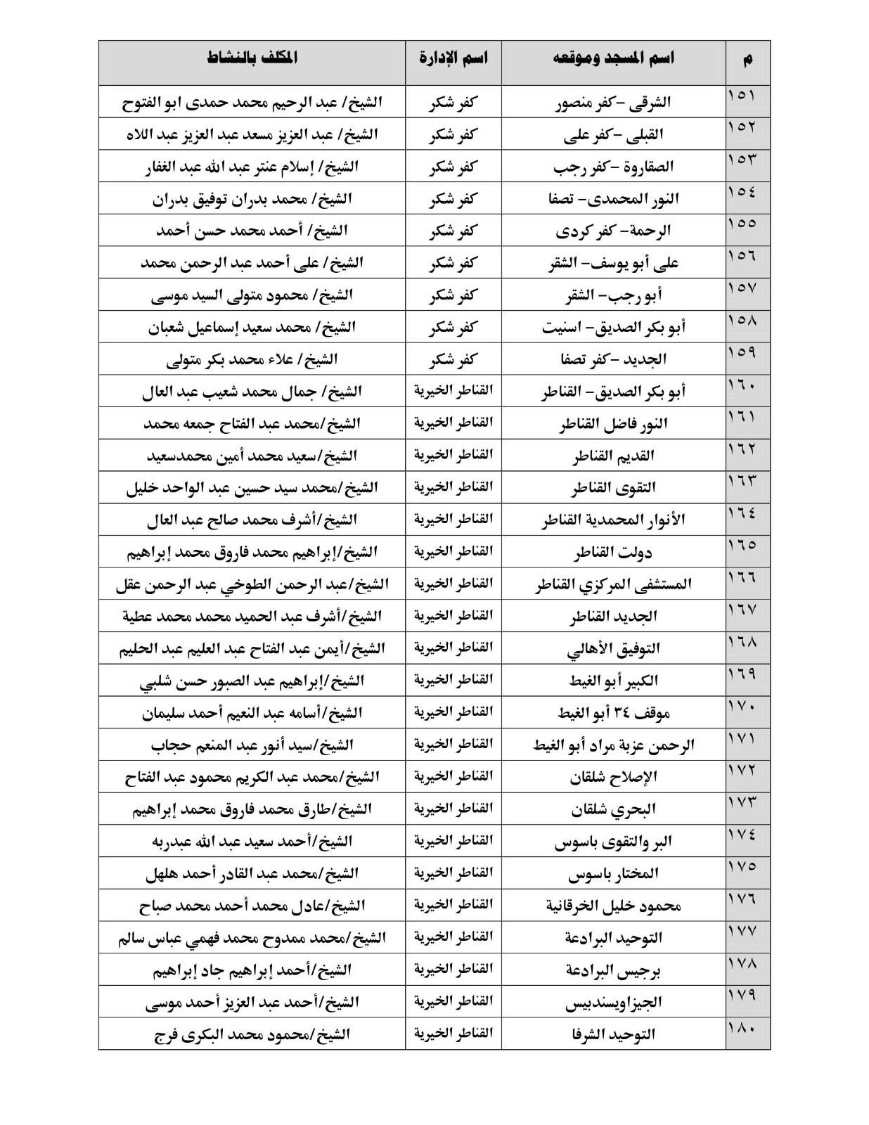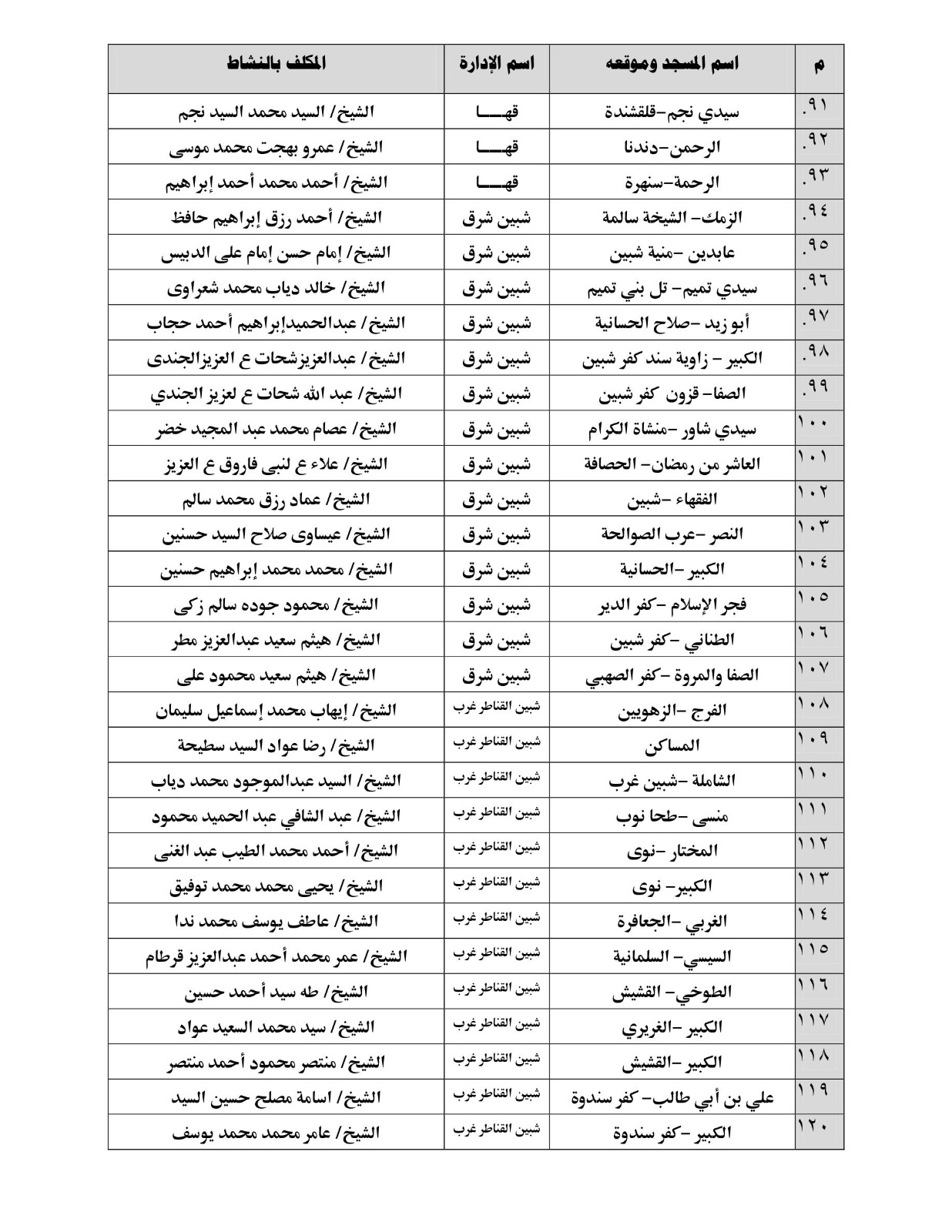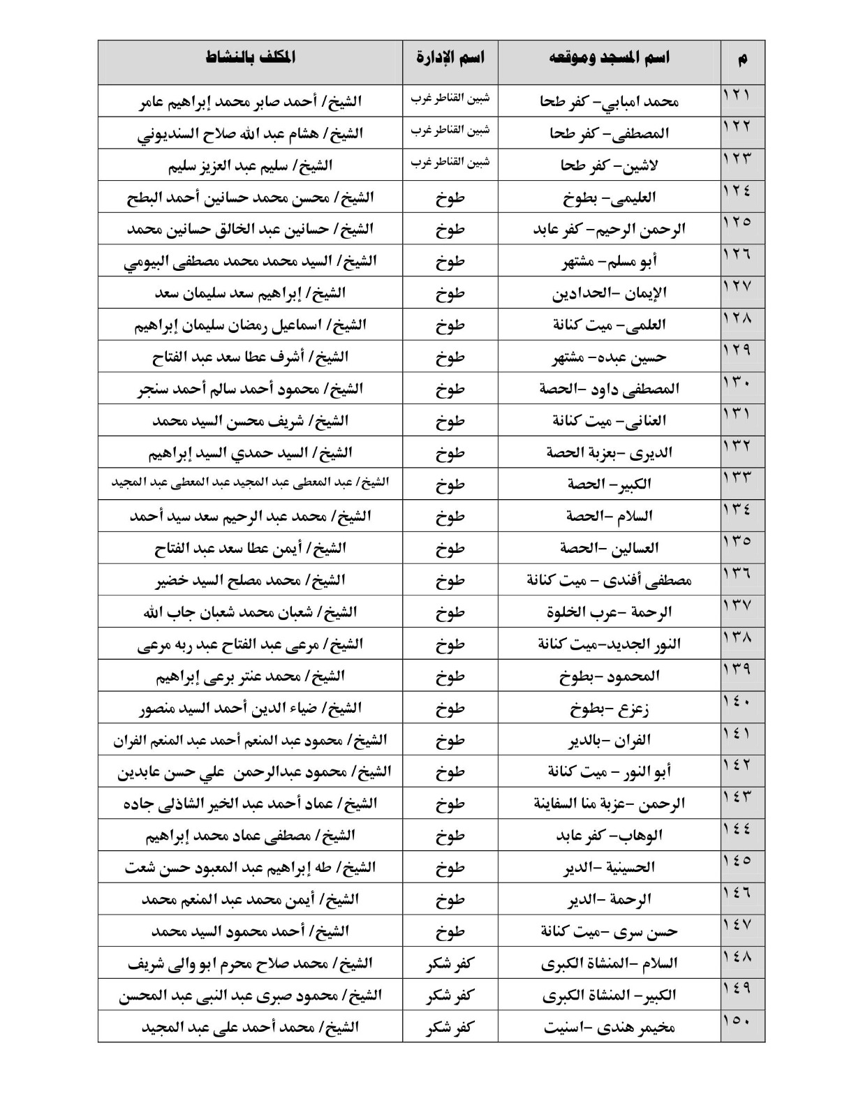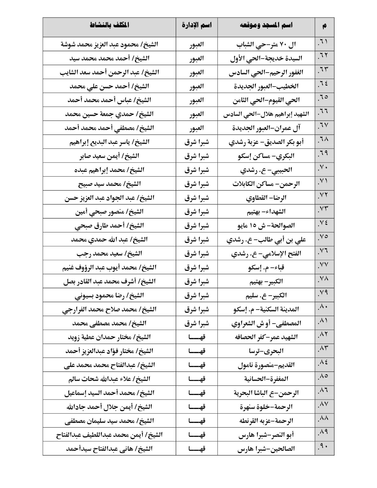 وأكدت وزارة الأوقاف في بيان، أنه سيقوم إمام المسجد بمراجعة الجزء الثلاثين من القرآن الكريم مع بيان معاني المفردات ومقاصد السور من خلال كتاب (البيان على المنتخب) من إصدارات المجلس الأعلى للشئون الإسلامية، مع شرح ما تيسر من الأخلاق والآداب العامة، ويسرنا أن ننشر أسماء المساجد ومواقعها التي سيكون بها مبادرة "حصن طفلك" بمحافظة القليوبية، فعلى من يرغب التواصل مع إمام المسجد لتسجيل أبنائه للمشاركة في المبادرة وذلك على النحو التالي: