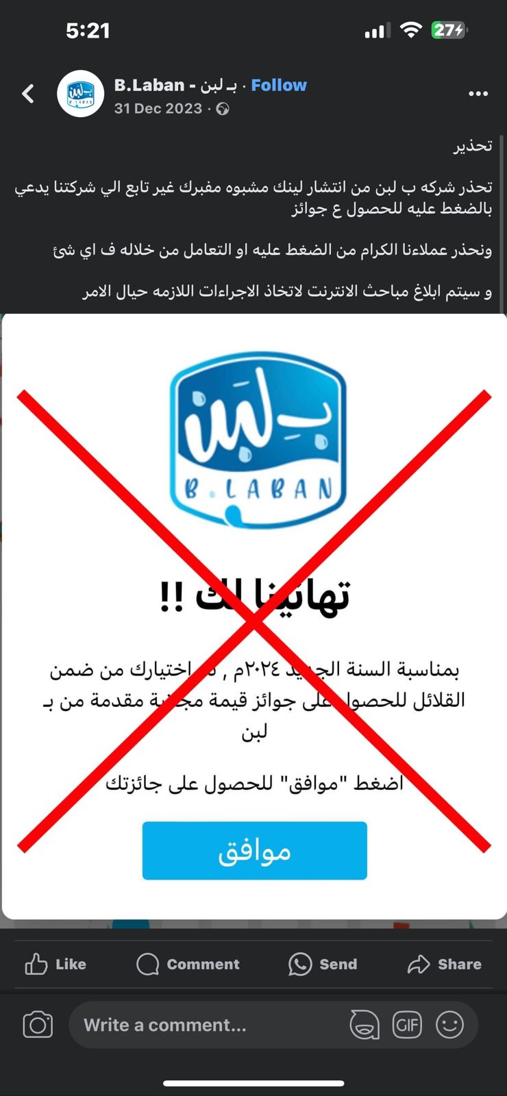 وحذرت شركة بـ لبن، من انتشار لينك مشبوه مفبرك غير تابع للشركة، يوجه العملاء بالضغط عليه للحصول على جوائز.