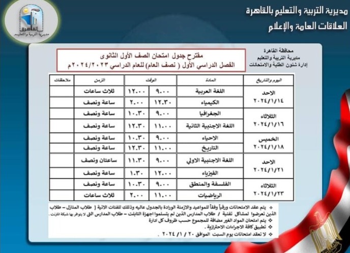 أعلنت مديرية التربية والتعليم بمحافظة القاهرة، جدول امتحانات الصف الأول الثانوي للترم الأول للعام الدراسي الحالي 2023-2024 كالآتي:
