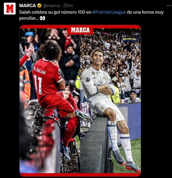 ونشرت ماركا الإسبانية صورة احتفال محمد صلاح أمام فريق نيوكاسل، وبجانبها صورة احتفال النجم البرتغالي كريستيانو رونالدو في إحدى المباريات بالدوري الإسباني حينما كان لاعبًا في صفوف فريق ريال مدريد، واحتفل بنفس احتفال قائد منتخب مصر.
