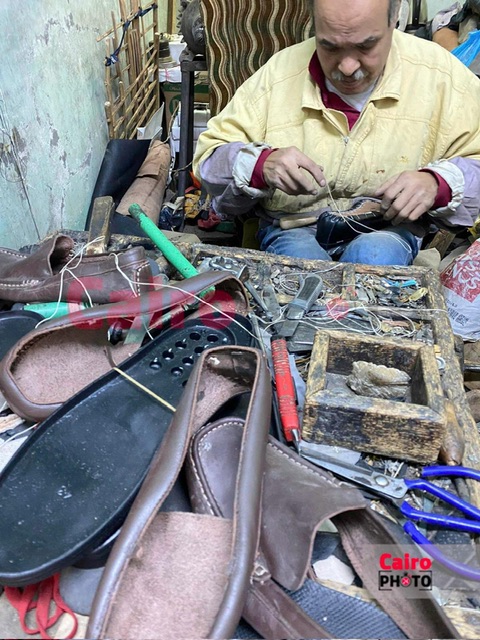 يجلس منهمكًا بيده المخراز والخيط الحرير والإبرة والشمع الاسكندراني أو العسلى كما يطلقون علية يحيك الأحذية على الطريقة القديمة في محل والدة الصغير الذي جاوز ال60 عاما بشارع السوق السياحي في مهنة متوارثة له بمدينة الأقصر.