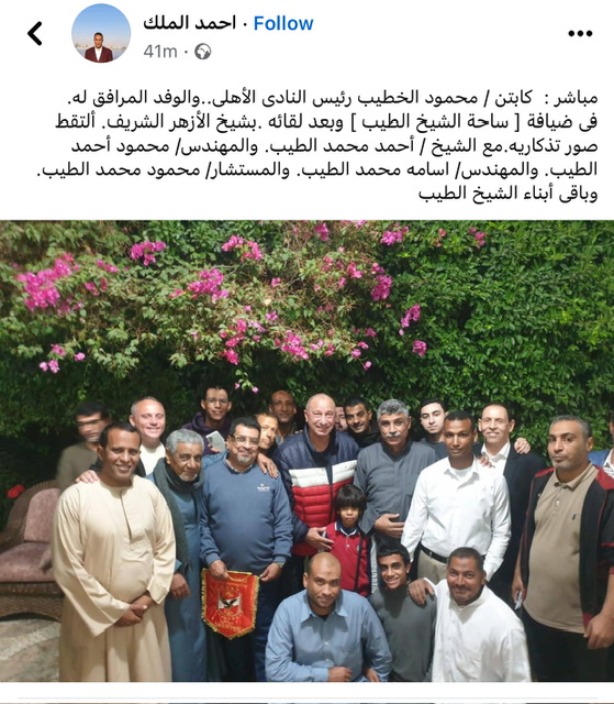 تصدرت صورة أظهرت الكابتن محمود الخطيب رئيس النادي الأهلي، يزور ساحة الشيخ الطيب في الأقصر اليوم الأربعاء، صفحات التواصل الاجتماعي بالأقصر، حيث انهالت التعليقات المرحبة بزيارة الخطيب.