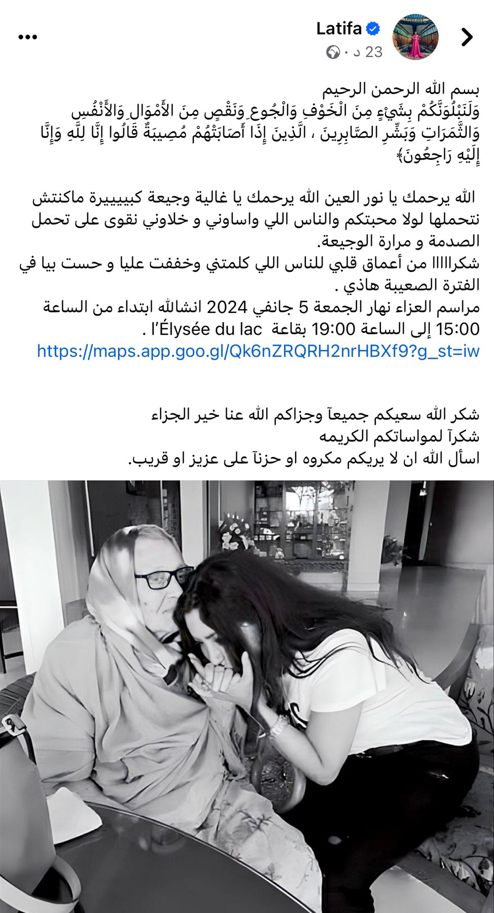 ونشرت لطيفة عبر حسابها الشخصي على الفيس بوك، صورة تجمعها بوالدتها الراحلة، وكتبت عليها: بسم الله الرحمن الرحيم "وَلَنَبْلُوَنَّكُمْ بِشَيْءٍ مِنَ الْخَوْفِ وَالْجُوعِ وَنَقْصٍ مِنَ الأَمْوَالِ وَالأَنْفُسِ وَالثَّمَرَاتِ وَبَشِّرِ الصَّابِرِينَ، الَّذِينَ إِذَا أَصَابَتْهُمْ مُصِيبَةٌ قَالُوا إِنَّا لِلَّهِ وَإِنَّا إِلَيْهِ رَاجِعُونَ".