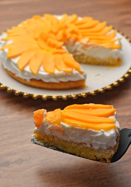 - نزين الكنافة بشرائح المانجو، ونضع المكعبات الصغيرة على الوجه.