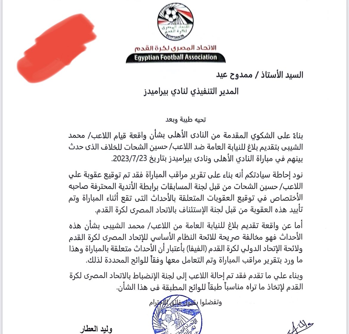 ولم يتضمن خطاب اتحاد الكرة إشارة إلى موعد جلسة التحقيق التي سيخضع لها اللاعب محمد الشيبي أمام لجنة الانضباط، بعد قرار إحالته إليها.