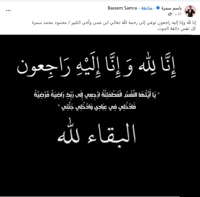 وكتب عبر حسابه الشخصي على فيسبوك: إنا لله وإنا إليه راجعون توفي إلى رحمة الله تعالى ابن عمي وأخي الكبير محمود محمد سمرة كل نفس ذائقة الموت.