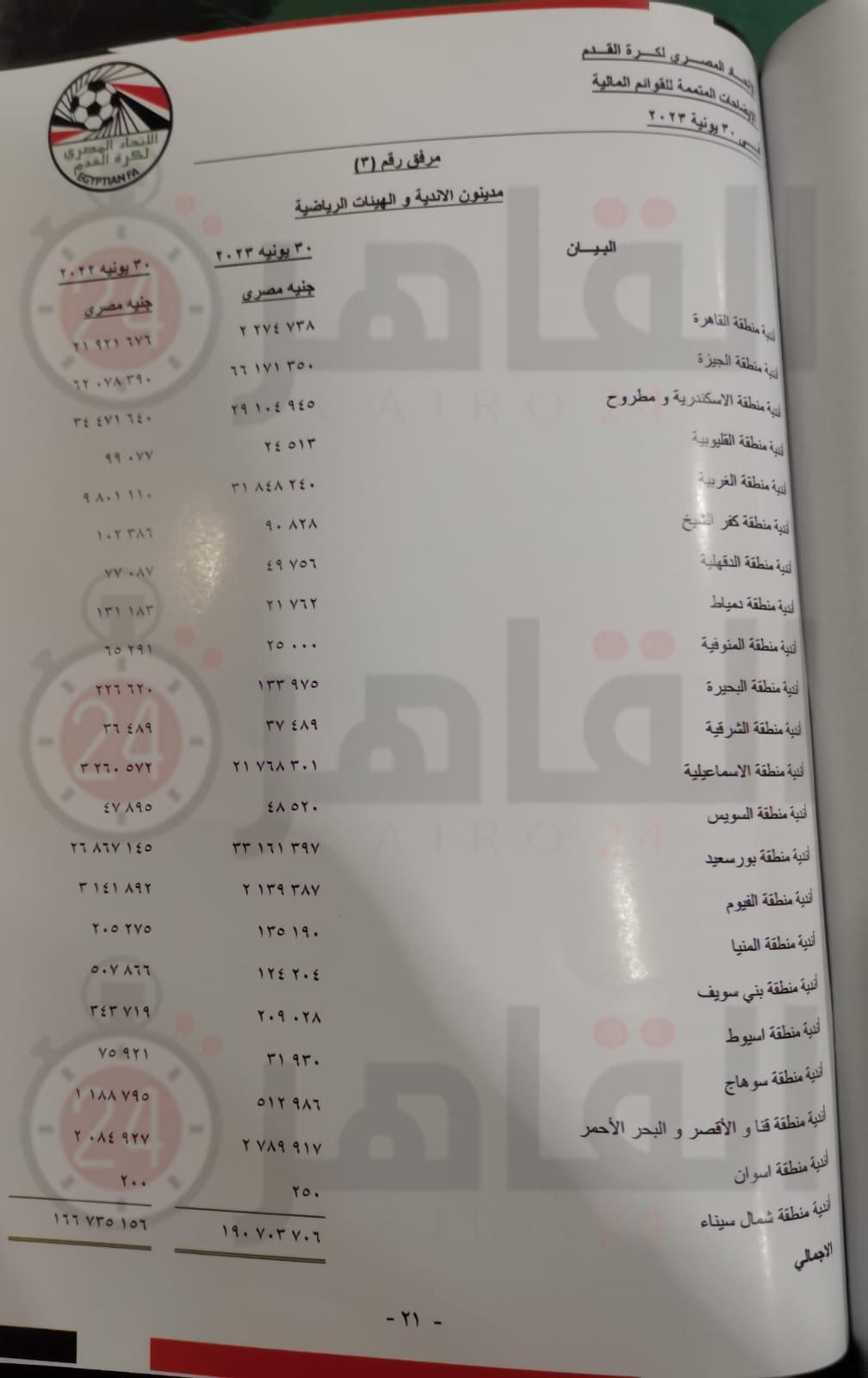ووفقا لمستند حصل القاهرة 24 على نسخة منه، يصل إجمالي المديونيات المستحقة لاتحاد الكرة لدى الأندية لنحو 190 مليون و703 ألف جنيه، وذلك بنهاية العام المالي المنقصي في 30 يونيو الماضي.