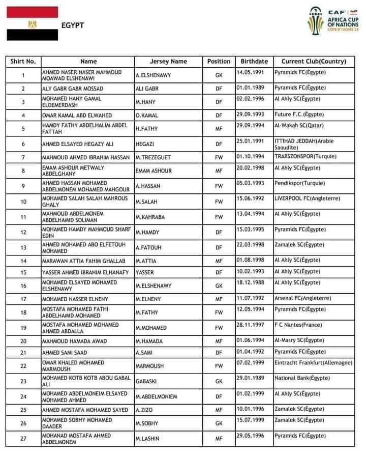 وجاءت قائمة منتخب مصر بالأسماء والأرقام والتي نشرها الحساب الرسمي للاتحاد الإفريقي لكرة القدم “كاف”، على النحو التالي:-