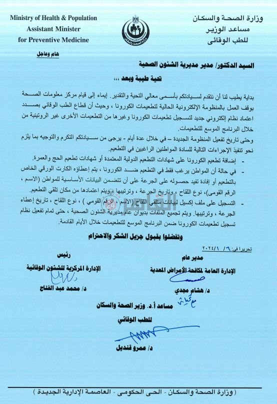 وفقا لخطاب حصل القاهرة 24 على نسخة منه، أوضحت وزارة الصحة، أن هذا الإجراء استعدادًا لتفعيل نظام إلكتروني جديد لتسجيل تطعيمات الكورونا وغيرها من التطعيمات الأخرى غير الروتينية في إطار البرنامج الموسع للتطعيمات.