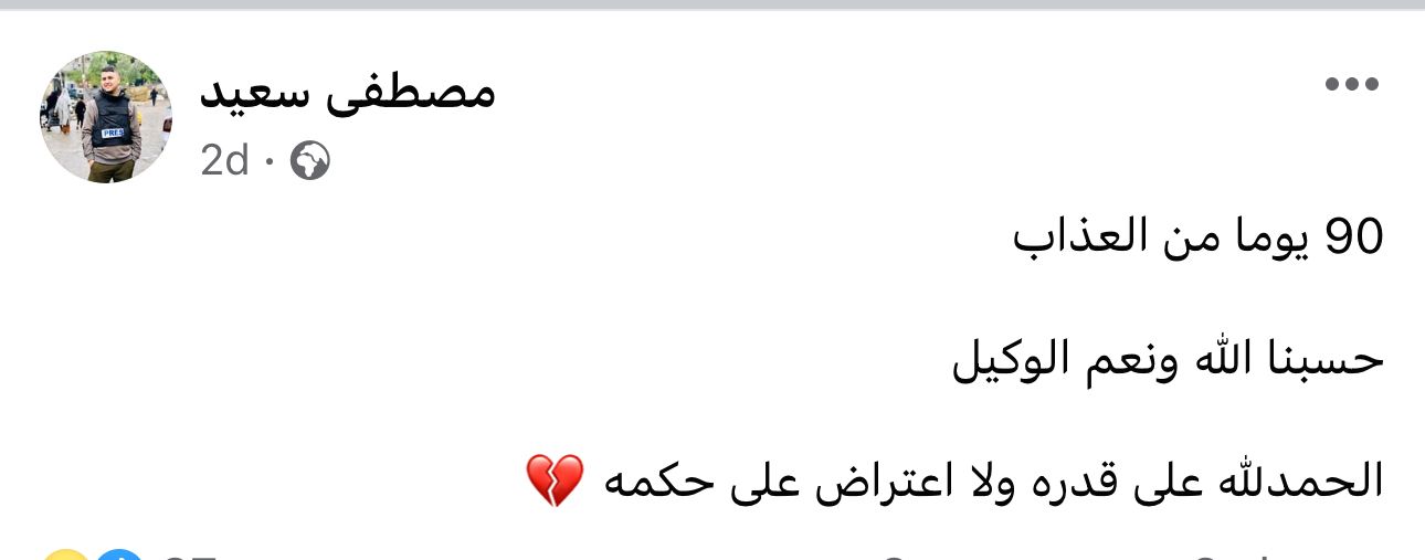 90 يوما من العذاب.. حسبنا الله ونعم الوكيل.. الحمدلله على قدره ولا اعتراض على حكمه، بتلك الكلمات وصف الشهيد الصحفي مصطفى ثريا، حال وطنه فلسطين قبل ارتقائه شهيدًا بيومين فقط، جراء قصف إسرائيلي استهدف سيارة صحفيين بخان يونس جنوب قطاع غزة، رفقة الشهيد الصحفي حمزة، نجل مراسل الجزيرة وائل الدحدوح.
