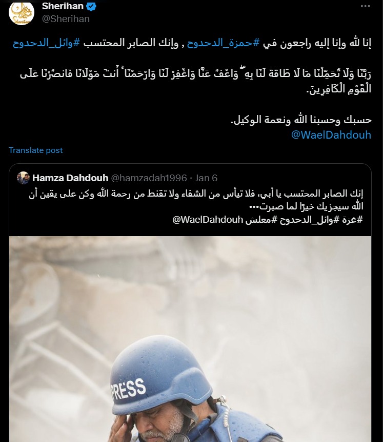وكتبت شريهان نعيًا لـ نجل وائل الدحدوح، عبر تغريدة لها، بموقع التدوينات القصيرة X تويتر سابقًا، قالت فيها: إنا لله وإنا إليه راجعون في حمزة الدحدوح، وإنك الصابر المحتسب، وائل الدحدوح، ربنا ولا تحملنا ما لا طاقة لنا به، واعف عنا واغفر لنا وارحمنا أنت مولانا فانصرنا على القوم الكافرين.. حسبك وحسبنا الله ونعم الوكيل.