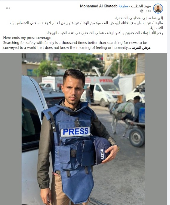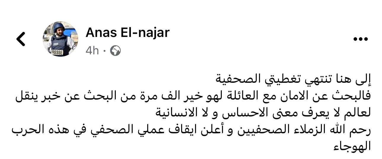 وقال الصحفي الفلسطيني، في منشور له عبر صفحته الرسمية بموقع التواصل الاجتماعي فيسبوك: إلى هنا تنتهي تغطيتي الصحفية فالبحث عن الأمان مع العائلة لهو خير ألف مرة من البحث عن خبر ينقل لعالم لا يعرف معنى الإحساس ولا الإنسانية.. رحم الله الزملاء الصحفيين وأعلن إيقاف عملي الصحفي في هذه الحرب الهوجاء.