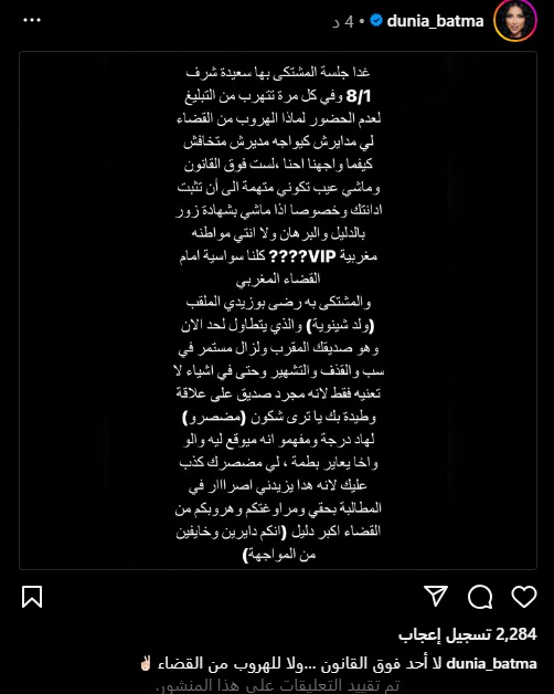 وكتبت دنيا بطمة، منشورًا عبر حسابها الشخصي بموقع تبادل الصور والفيديوهات القصيرة انستجرام، قائلة: غدا جلسة المشتكى بها، وفي كل مرة تتهرب من التبليغ لعدم الحضور، لماذا الهروب من القضاء لي مدايرش كيواجه مدیرش متخافش كيفما، واجهنا إحنا لست فوق القانون وماشي عيب تكوني متهمة إلى أن تثبت إدانتك وخصوصا إذا ماشي بشهادة زور، بالدليل والبرهان ولا أنتي مواطنة مغربية VIP.
