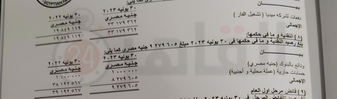 وبحسب مستند حصل القاهرة 24 على نسخة منه، بلغ إجمالي أرصدة اتحاد الكرة البنكية في 30 يونيو 2023 نحو 9 ملايين جنيه و279 ألف جنيه، بواقع مليون جنيه ودائع، و8 ملايين و279 ألف جنيه أرصدة جارية في البنوك بالعملة المحلية والأجنبية.