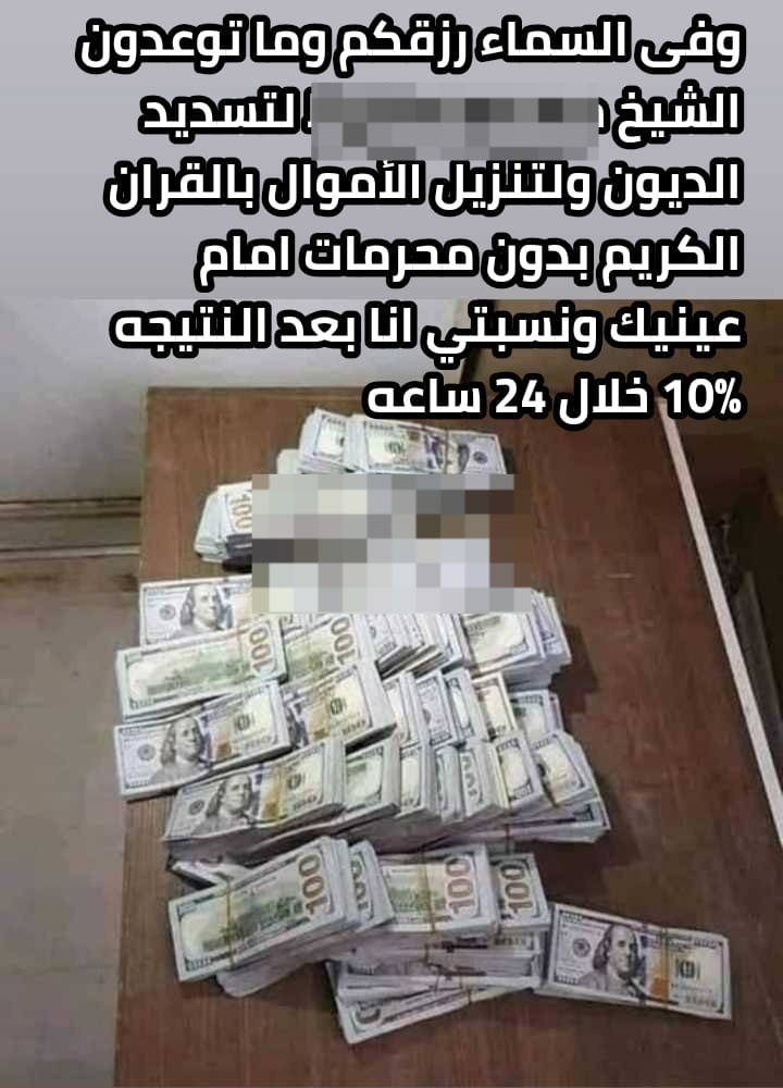 تعرضت سيدة تدعي ب. م، تعمل طبيبة صيدلية، للنصب على يد أحد الأشخاص، وإيهامها بقدرته على توفير أموال لها من خلال الدجل والشعوذة، وطلب تحويل أموال عن طريق خدمة فودافون كاش الخاصة به، حيث استولي منها على مبلغ 91 ألف جنيه.
