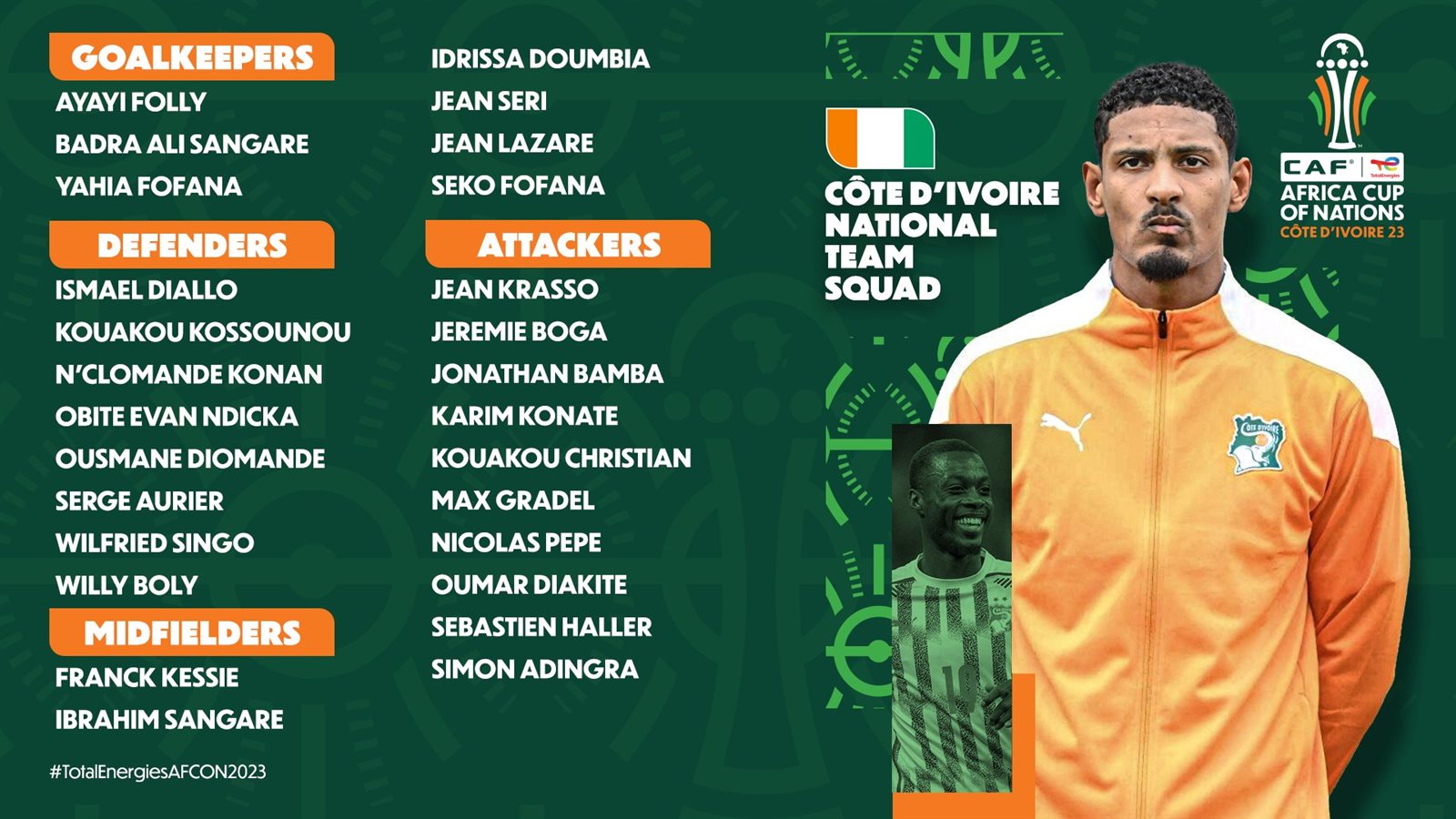 سيباستيان هالر مهاجم بروسيا دورتموند الألماني، وسيمون أدينجرا لاعب برايتون الإنجليزي، وفرانك كيسيه لاعب وسط أهلي جدة، وسيكو فوفانا لاعب وسط النصر السعودي.