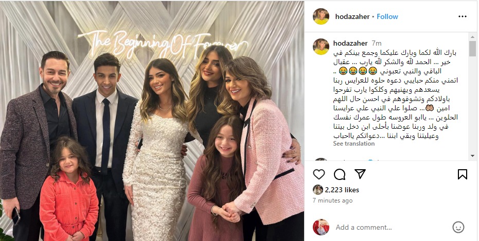 وتابعت زوجة أحمد زاهر: أتمنى منكم حبايبي دعوة حلوة للعرايس، ربنا يسعدهم ويهنيهم، وكلكوا يا رب تفرحوا بأولادكم، وتشوفوهم في أحسن حال اللهم آمين، صلوا على النبي على عرايسنا الحلوين، يا أبو العروسة طول عمرك نفسك في ولد، وربنا عوضنا بأحلى ابن دخل بيتنا، وعيليتنا وبقى ابننا.. دعواتكم يا أحباب.