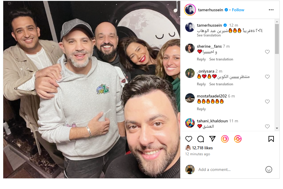 ونشر تامر حسين، صورة تجمعه بالفنانة شيرين عبد الوهاب، والملحنين عزيز الشافعي ومدين، والموزع الموسيقي توما، عبر حسابه الشخصي على موقع تبادل الصور والفيديوهات إنستجرام، وعلق عليها: قريبا 2024 شيرين عبد الوهاب.