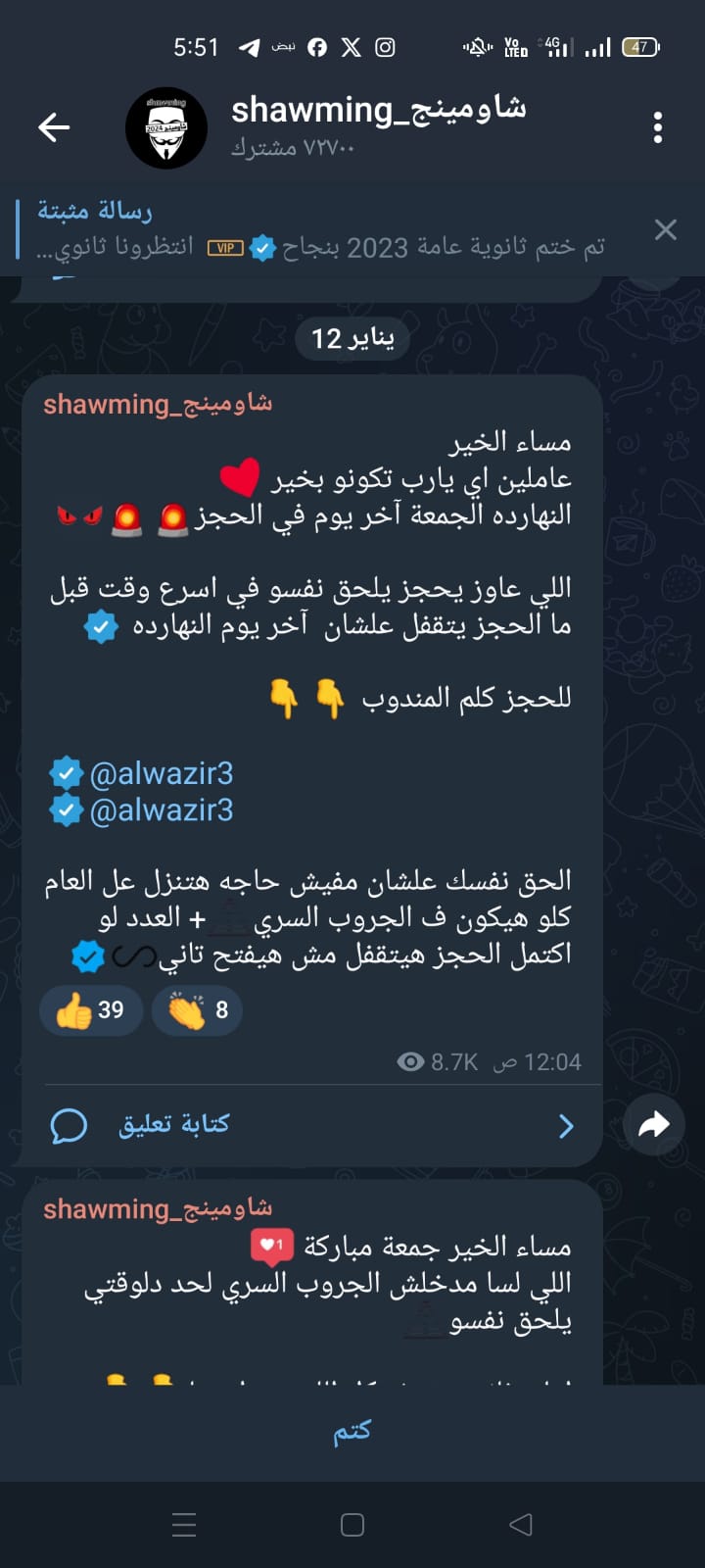 يواصل أدمن جروب الغش الإلكتروني شاومينج، تحريض الطلاب للحصول على الامتحانات، حيث كتب للطلاب: مساء الخير عاملين إيه يارب تكونوا بخير النهارده الجمعة آخر يوم في الحجز اللي عاوز يحجز يلحق نفسه في أسرع وقت قبل ما الحجز يتقفل علشان آخر يوم النهارده.