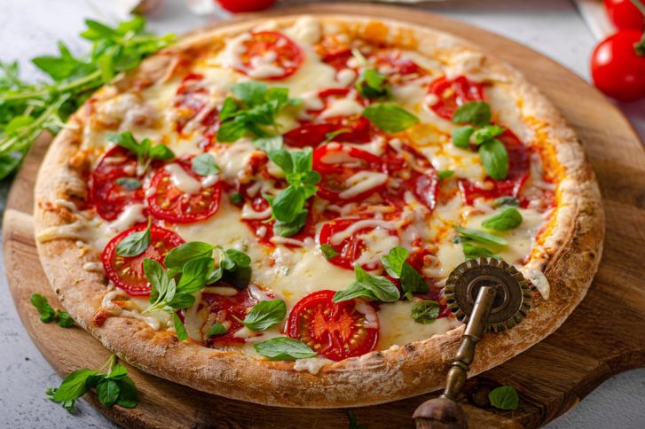 - قبل إخراج البيتزا من الفرن، أضيفي الجبنة الموزاريلا واتركيها لمدة 5 دقائق حتى تذوب، وقدمي البيتزا ساخنة.
