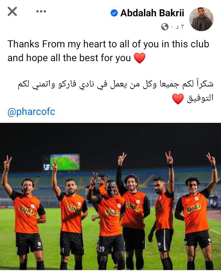 وكتب عبدالله بكري على حسابه الشخصي عبر موقع التواصل الاجتماعي فيس بوك: شكرا لكم جميعا، وكل من يعمل في نادي فاركو وأتمنى لكم التوفيق.