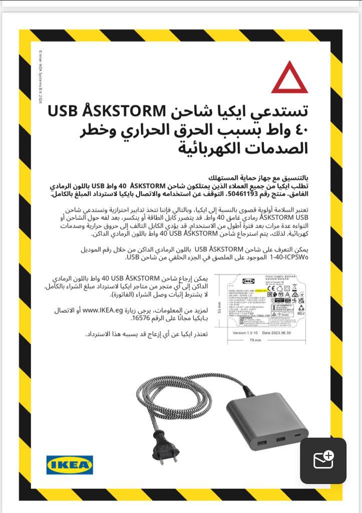 أعلنت شركة ايكيا، حملة استدعاء لشاحن (USB ASKSTORM ) 40 واط باللون الرمادي الغامق، وذلك بسبب الحرق الحراري وخطر الصدمات الكهربائية، منتج رقم 50461193، مشيرة إلى أنه يجب من مالكي هذا المنتج التوقف عن استخدامه فورا والاتصال بايكيا لاسترداد المبلغ بالكامل.