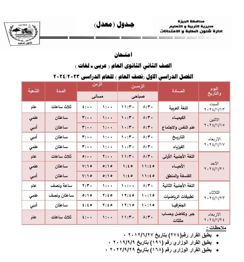 أما طلاب الفترة المسائية فيؤدون امتحاني الكيمياء وعلم النفس في تمام الساعة الـ1 ظهرًا وتنتهي الساعة الـ3 عصرًا، وذلك وفقًا للجدول المعلن من قبل مديرية التربية والتعليم بالجيزة.