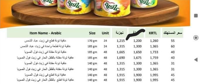 ورفعت الشركة سعر علبة التونة عافية قطع مفتتة إلى 40 جنيها لوزن 185 جراما، وأقرت الشركة زيادة سعر تونة عافية في زيت الصويا إلى 31 جنيها وزن 140 جراما، ورفعت سعر تونة مفتتة بالفلفل وزن 140 جراما إلى 31 جنيها.