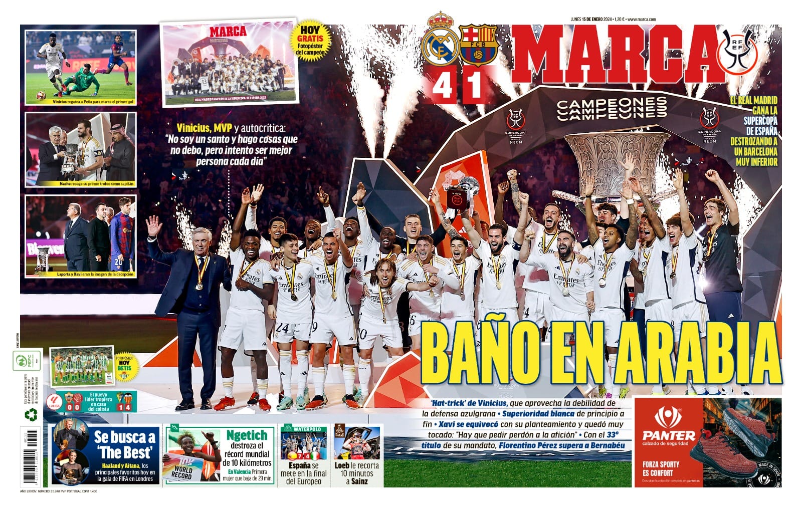 قالت صحيفة ماركا الإسبانية في غلافها، حمّام أهداف في السعودية بقيادة فينيسيوس أفضل لاعب في نهائي كأس السوبر الإسباني، حيث استغل فينيسيوس ضعف دفاع برشلونة، تفوّق النادي الأبيض من البداية وحتى النهاية وفي النهاية ريال مدريد فاز بكأس السوبر ودمّر برشلونة المتواضع جدًا كما ان فلورنتينو بيريز تفوق على سانتياجو برنابيو بعدد الألقاب كرئيس للنادي الملكي.