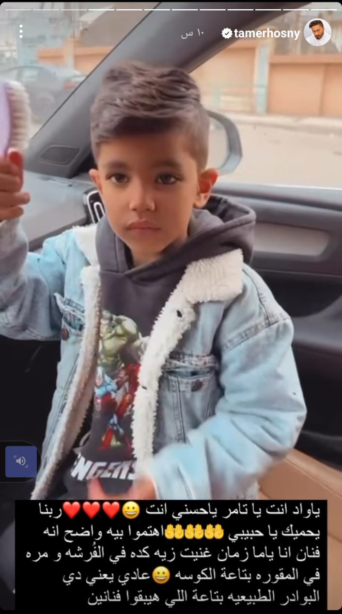 وشارك تامر حسني متابعيه، مقطع فيديو لطفل وهو يغني في فرشاة الشعر، عبر حسابه الشخصي بموقع انستجرام، وعلق عليه قائلًا: يا واد أنت يا تامر حسني، أنت ربنا يحميك يا حبيبي، اهتموا به وأضح إنه فنان.