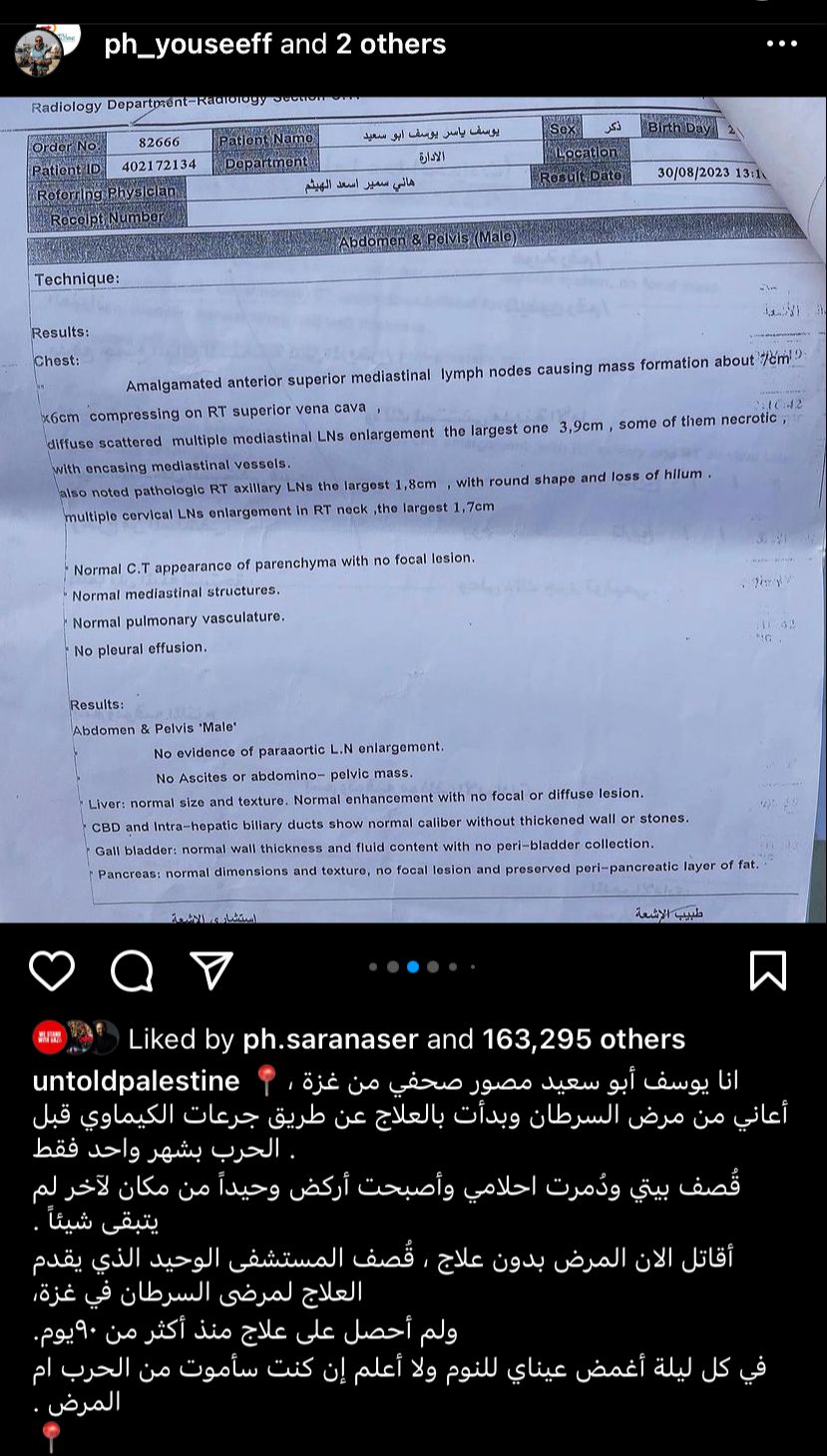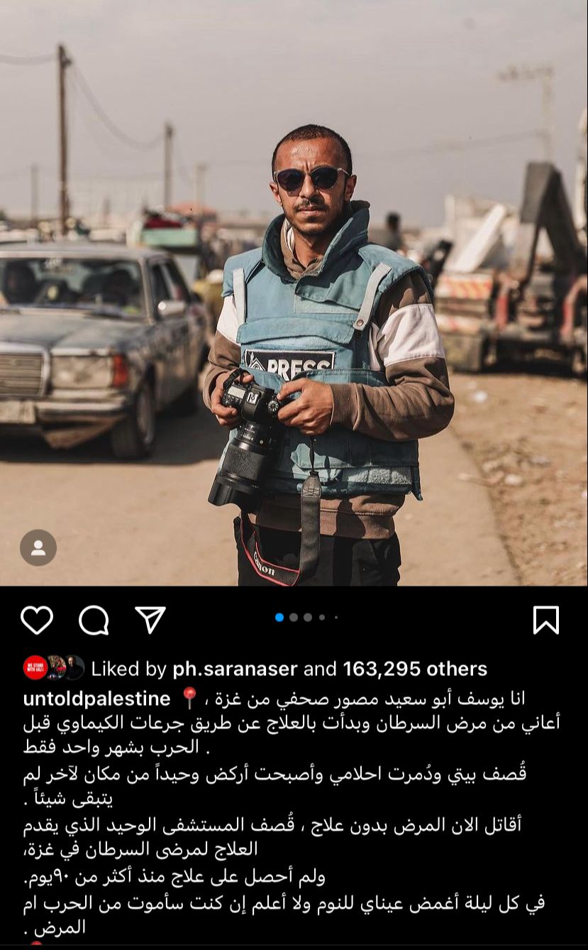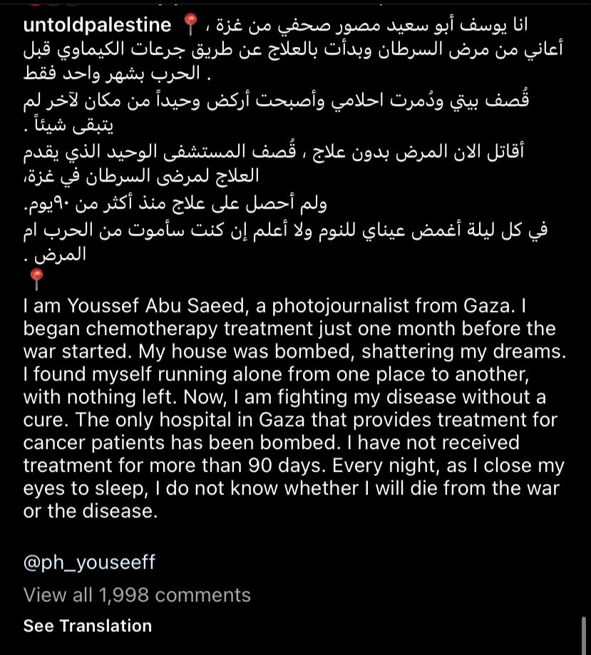 وكتب عبر حسابه الشخصي بموقع تبادل الصور والفيديوهات إنستجرام: أنا يوسف أبو سعيد مصور صحفي من غزة أعاني من مرض السرطان، وبدأت بالعلاج عن طريق جرعات الكيماوي قبل الحرب بشهر واحد فقط.