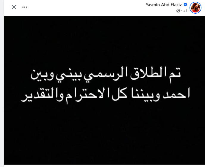 وأعلنت الفنانة ياسمين عبد العزيز، منذ قليل انفصالها عن الفنان أحمد العوضي، وكتبت ياسمين عبد العزيز منشورًا، عبر حسابها الشخصي فيس بوك: تم الطلاق بيني وبين أحمد وبينا كل الاحترام والتقدير.