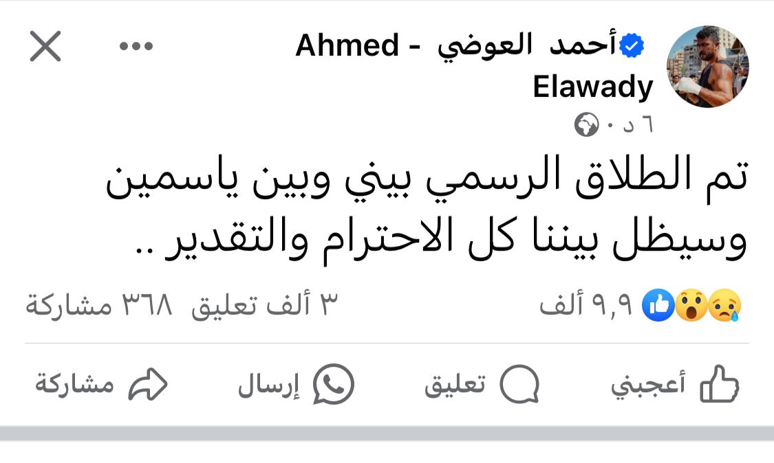 وفي أول تعليق من الفنان أحمد العوضي على طلاقه من ياسمين عبد العزيز، كتب منشورًا عبر حسابه الشخصي بموقع فيسبوك، جاء فيه: تم الطلاق رسمي بيني وبين ياسمين عبد العزيز، وسيظل بيننا كل الاحترام والتقدير.