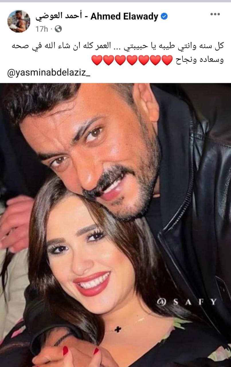 ياسمين عبد العزيز احتفلت بعيد ميلادها، أمس، على حسابها الرسمي بـ انستجرام، حيث نشرت صورة لها، بينما احتفل العوضي بعيد ميلادها على حسابه الرسمي بـ فيس بوك، ونشر صورة تجمعهما، معلقًا: كل سنة وانتي طيبة ياحبيبتي.. العمر كله إن شاء الله في صحة وسعادة ونجاح.