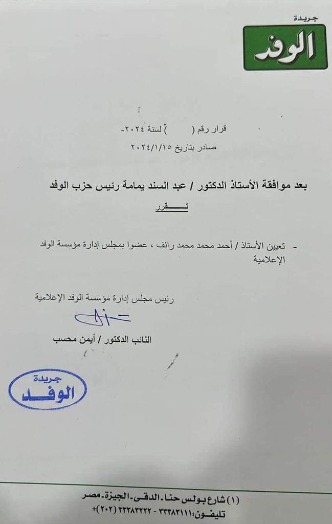 وفي السياق ذاته، اتخذ الدكتور أيمن محسب، رئيس مجلس إدارة جريدة الوفد، قرارًا بالاعتماد على شقيق النائبة نشوى رائف كـ عضو بمجلس إدارة مؤسسة الوفد الإعلامية، وذلك بعد موافقة رئيس الحزب، لافتًا إلى أن القرار سيتم العمل به بدأ من اليوم، وذلك حسب المستند الذي حصل عليه القاهرة 24.