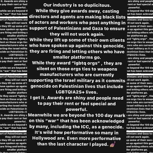 وكتبت الممثلة الأمريكية عبر حسابها الشخصي بإنستجرام: بينما يمنحون جوائز الإيمي 2024، يعد الوكلاء، قوائم سوداء للممثلين والعاملين الذين ينشرون أي شيء لدعم الفلسطينيين في غزة، لضمان أنهم لن يعملوا مرة أخرى.