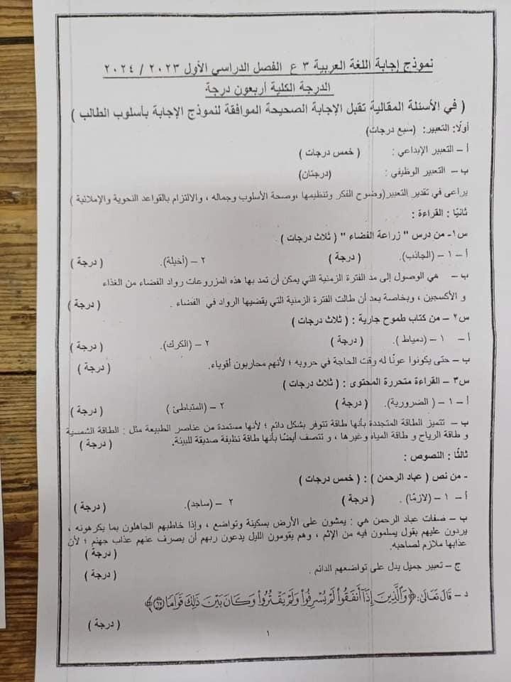 نموذج إجابة امتحان اللغة العربية للصف الثالث الإعدادي 2024