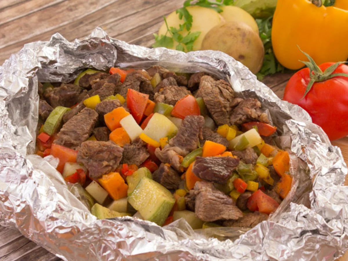 - افردي قطعة من ورق الألومنيوم على طبق التقديم، واسكبي اللحمة بالخضار بالصوص الخاص بها داخل ورق الألومنيوم، ثم اغلقي الورقة وقدميها ساخنة مع الأرز والسلطة.