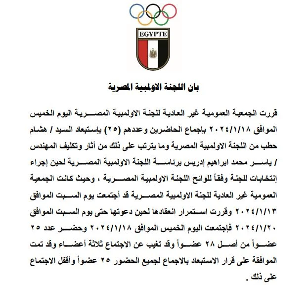 وأضاف بيان اللجنة الأولمبية: كانت الجمعية العمومية غير العادية للجنة الأولمبية المصرية قد اجتمعت يوم السبت 13 يناير 2024، وقررت استمرار انعقادها لحين دعوتها حتى يوم السبت 20 يناير فاجتمعت اليوم الخميس وحضر 25 عضوا من أصل 28 عضوا وقد تغيب عن الاجتماع ثلاثة أعضاء، وقد تمت الموافقة على قرار الاستبعاد بالإجماع لجميع الحضور 25 عضوا وأقفل الاجتماع على ذلك.