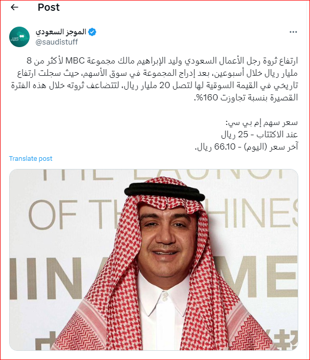 كما أعلنت صحيفة الموجز السعودي، ارتفاع ثروة رجل الأعمال السعودي وليد الإبراهيم مالك مجموعة MBC لأكثر من 8 مليارات ريال خلال أسبوعين، بعد إدراج المجموعة في سوق الأسهم، حيث سجلت ارتفاعا تاريخيا في القيمة السوقية لها لتصل 20 مليار ريال، لتتضاعف ثروته خلال هذه الفترة القصيرة بنسبة تجاوزت 160%.