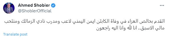 وكتب أحمد شوبير عبر حسابه الرسمي على موقع إكس: أتقدم بخالص العزاء في وفاة الكابتن أيمن اليمني، لاعب ومدرب نادي الزمالك ومنتخب مالي الأسبق، إنا لله وإنا إليه راجعون.