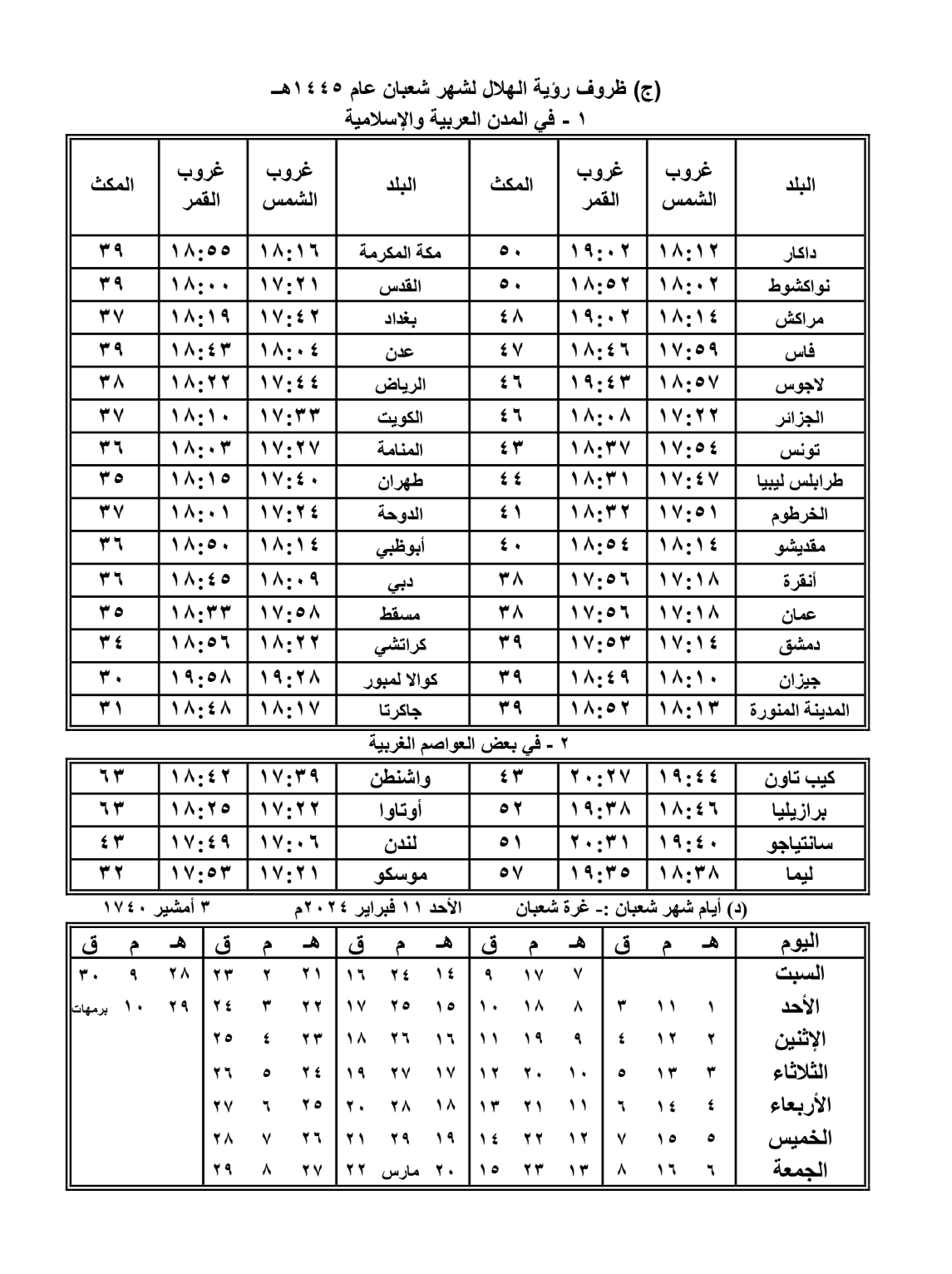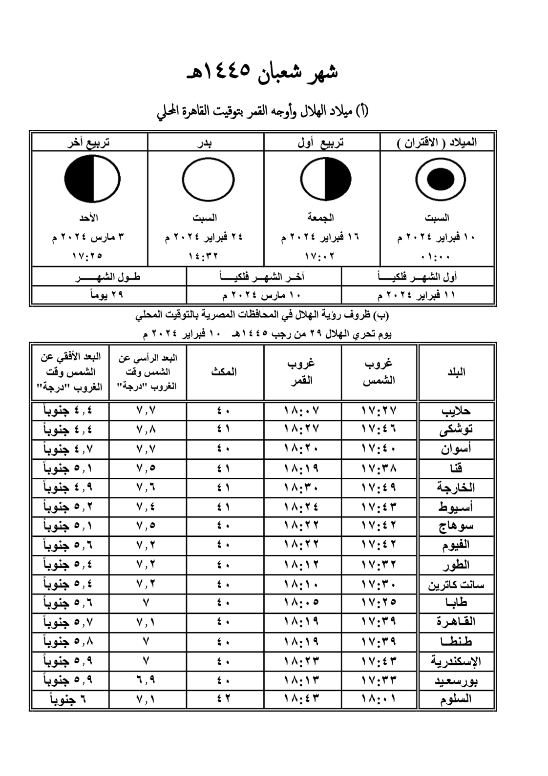 واصل المعهد: وبذلك تكون غرة شهر شعبان 1445 فلكيًا يوم الأحد 10 فبراير 2024، متابعا: وفيما يلي بيان مفصل عن ظروف رؤية الهلال وأوجه القمر في مدينة القاهرة ومحافظات جمهورية مصر العربية وبعض العواصم العربية والإسلامية والغربية يوم تحري الهلال وضع وشكل الهلال على الأفق الغربي بعد غروب الشمس في مدينة القاهرة (يوم الرؤية).