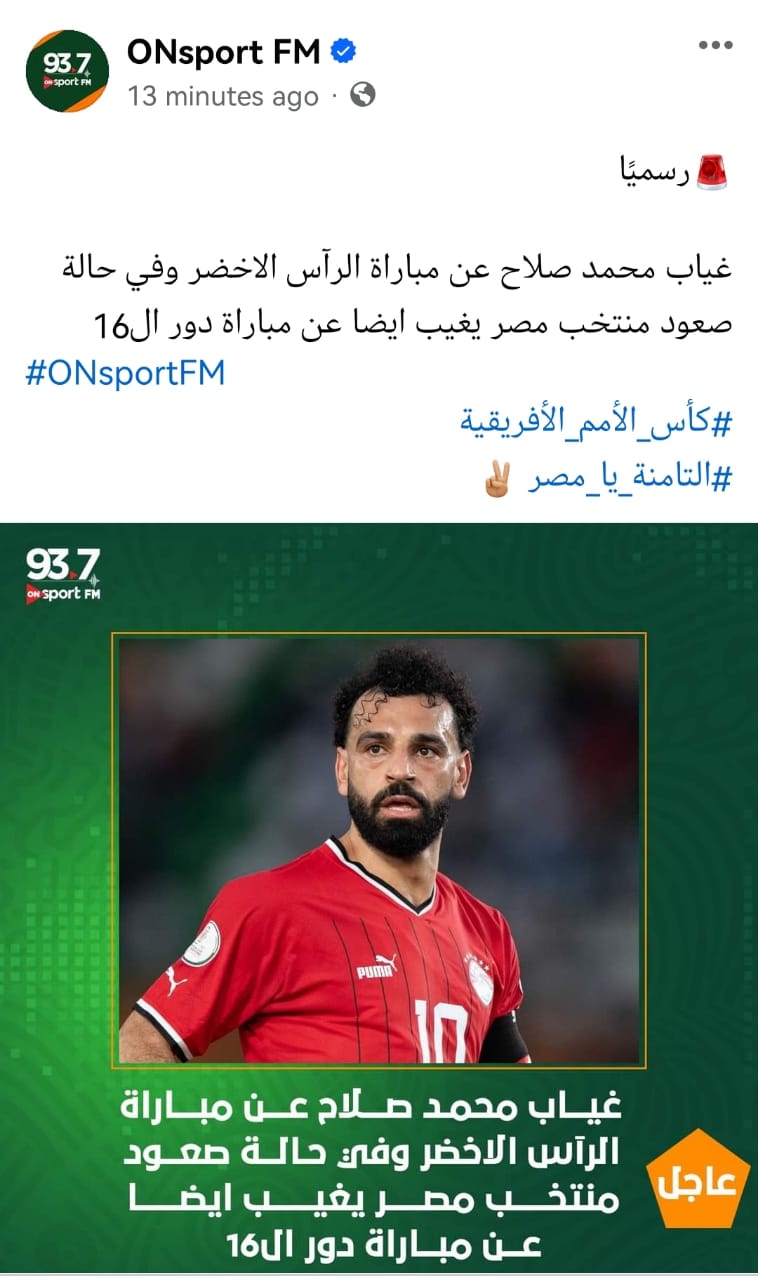 وبحسب ما نقله حساب راديو أون سبورت إف إم على فيسبوك، تأكد غياب محمد صلاح عن مباراة الرأس الأخضر، وفي حالة صعود منتخب مصر يغيب أيضا عن مباراة دور الـ 16 ببطولة أمم إفريقيا.