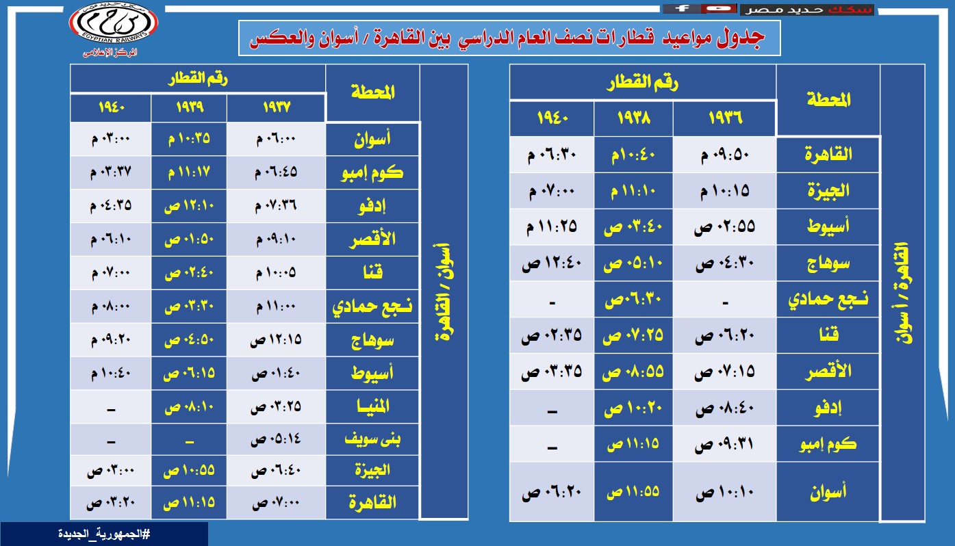 أعلنت الهيئة القومية لسكك حديد مصر، بدء تشغيل القطارات الإضافية بين القاهرة وأسوان بمناسبة إجازة نصف العام الدراسي؛ وذلك لتلبية رغبات المسافرين من الشركات السياحة وطلاب الجامعات والهيئات المختلفة بهدف استيعاب الأعداد المتزايدة من الركاب وللمساهمة في تنشيط السياحة الداخلية بمدن الوجه القبلي.