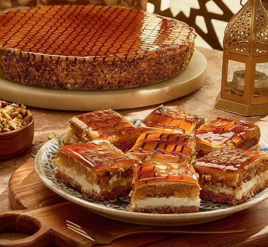 - في طبق كبير مناسب لحجم الصواني نضع الكنافة ثم طبقة القشطة، ثم البسبوسة ثم طبقة الكراميل.