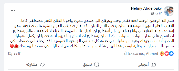 ونشر حلمي عبد الباقي عبر حسابه الشخصي على موقع الفيس بوك: بسم الله الرحمن الرحيم تحيه تقدير وحب وعرفان إلى صديق عمري وأخويا الفنان الكبير مصطفي كامل النقيب العام للمهن الموسيقية، أعلن رفضي التام للبيان الذي نشره صديقي العزيز على صفحته، وهو إسناده مهمة النقابة لي، وأنا بقوله لن ولم أستطع أن أقبل بتلك المهمة الثقيلة، لأنك حققت ما لم يستطع أي إنسان تحقيقه على مدار سنوات وسنوات.